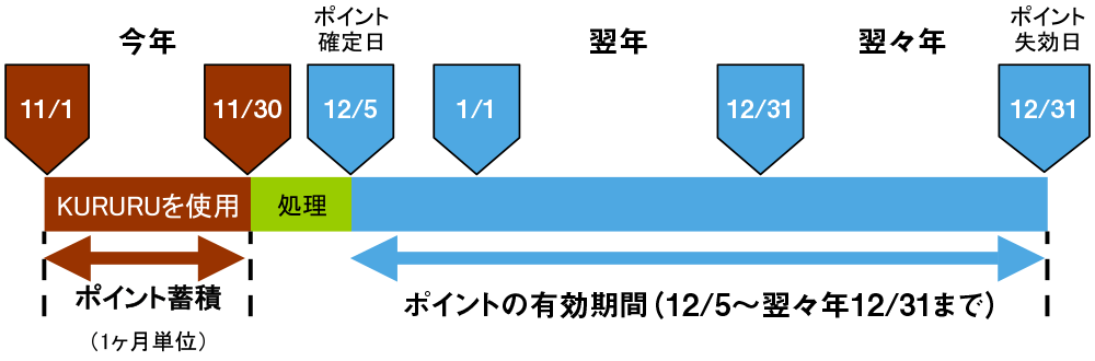 KURURU使用とポイントの有効期限の例(11月にKURURUを使用した場合)